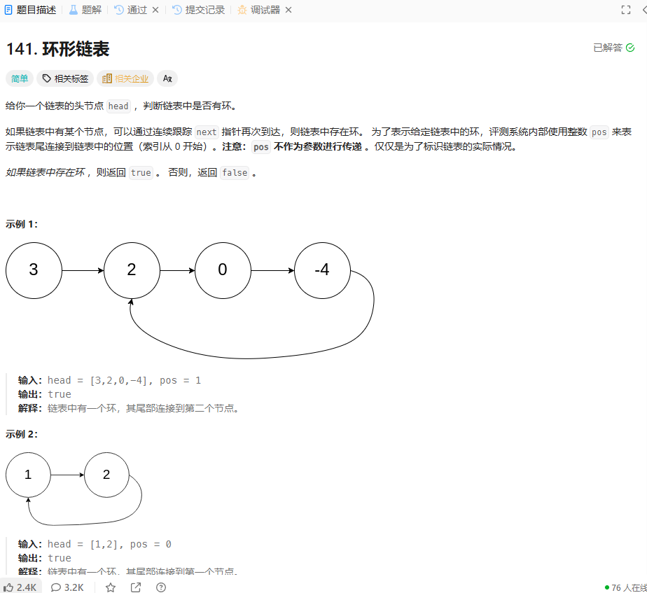 这一题,我先看了题解,题解中暴力求解的办法就是把每次遇到的指针(head)都加入到一个set()当中,然后循环体head,当head非空时,进行一个判断,如果head在set中出现过就回Ture,反之就False。下面是官方题解: