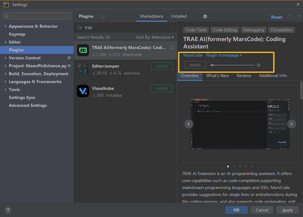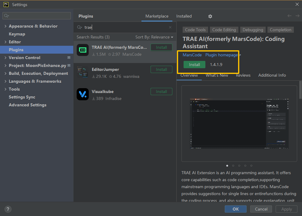 记得重新关闭,打开Pycharm编译器:否则你会搜索不到TRAE