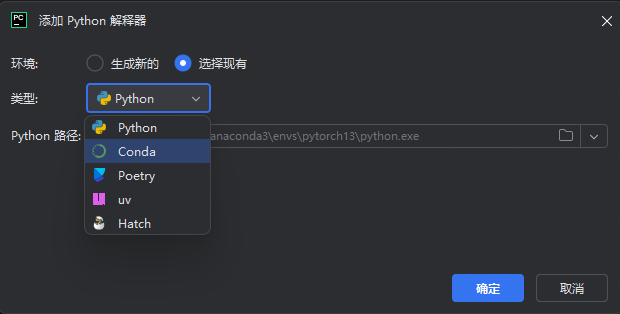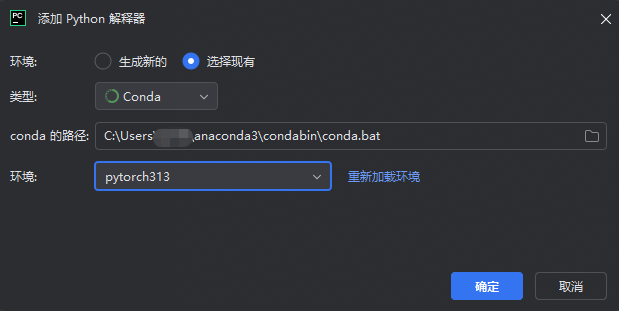 一般Pycharm会自动给出conda的路径,底下的环境里就可以看到刚才创建的虚拟环境,点确定即可。