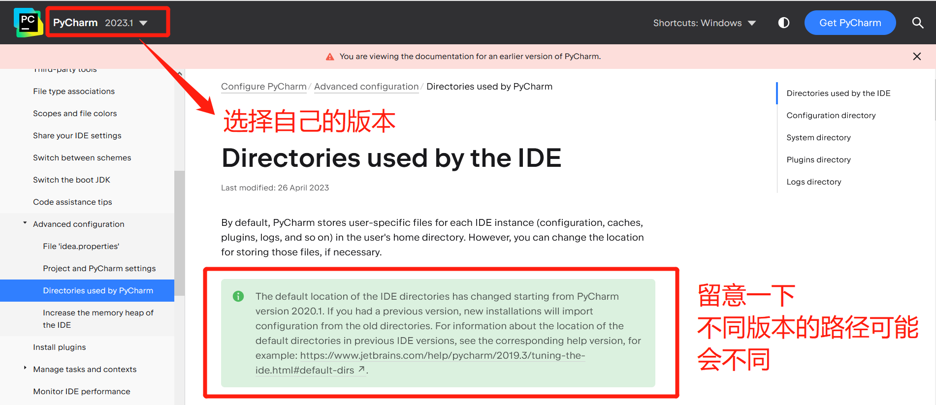 **第 ① 步:**打开官方链接,选择自己Pycharm版本对应的文档,不同的版本的路径可能有所不同。这里拿我的2023.1举例。