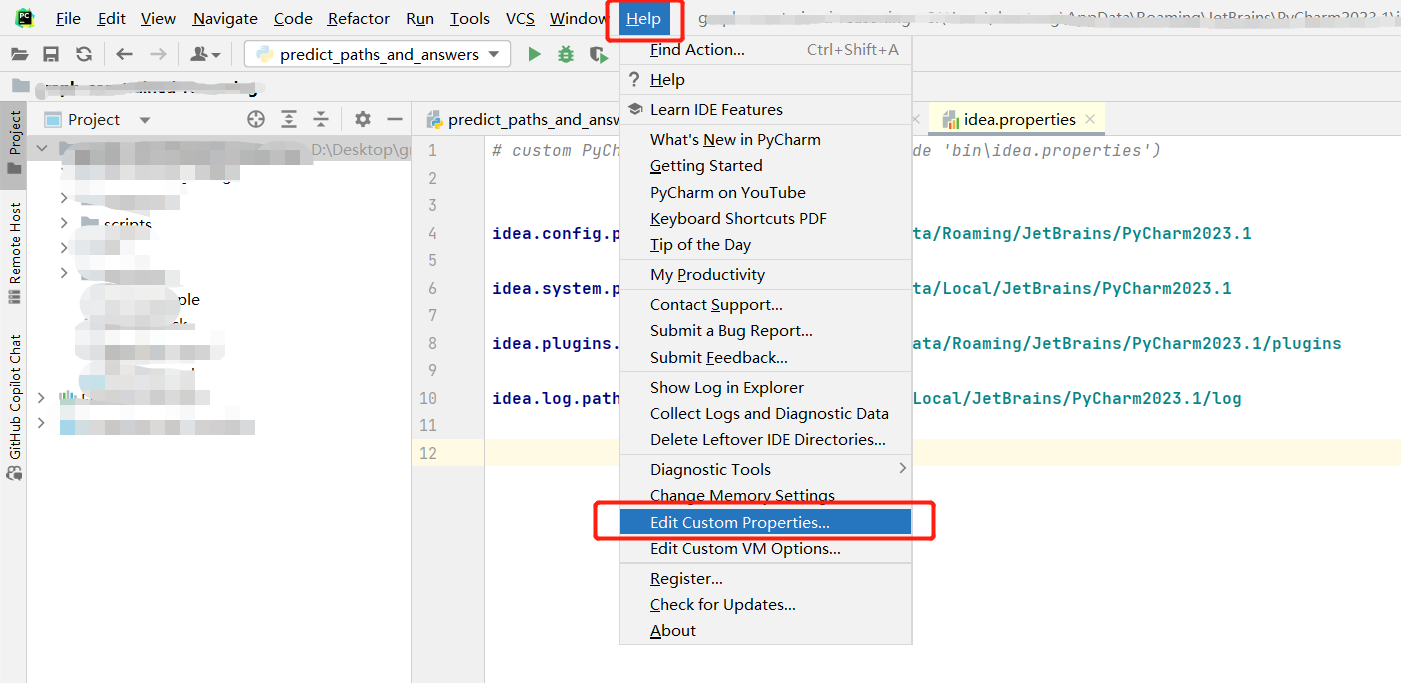 **(1)data.properties的运作原理:**在Pycharm界面点击Help | Edit Custom Properties,打开data.properties,然后就可以看到,data.properties的路径是++C:\Users\用户名\AppData\Roaming\JetBrains\PyCharm2023.1\data.properties++ 。每次开启Pycharm,它都要先找到data.properties,然后按照里面设置的新路径进行索引。它会去哪里找data.properties呢?会去上述的C盘Roaming路径里找,而不会去新路径里找!这就导致了: 如果更新路径之后,把原C盘的东西全部删除了,包括data.properties被也删了,那打开Pycharm的时候,Pycharm就找不到data.properties了,则新设的路径就不再有效,而是会变回默认的C盘Roaming, Local路径,同时Pycharm变成出厂状态,因为C盘文件夹已经被删完了,找不到任何配置了,相当于重装。因此,更新路径之后,可以 把原C盘的东西全部删除,但唯独data.properties 不能 删除。