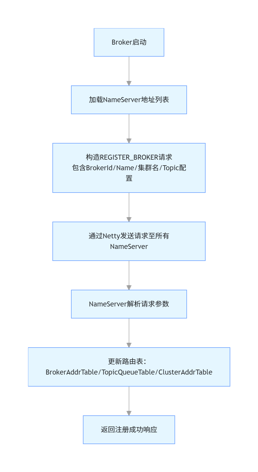 Broker 启动后会主动向所有 NameServer 节点发送注册请求,流程如下: