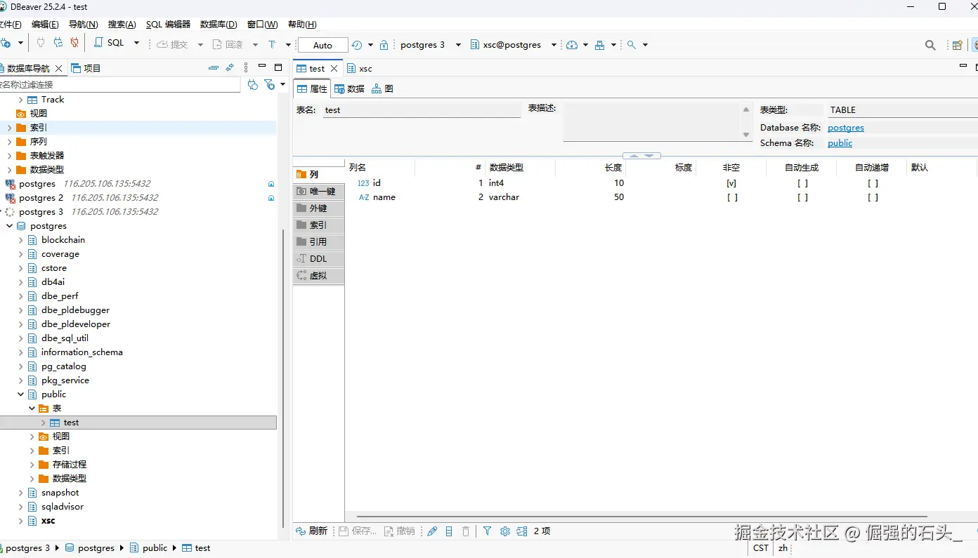 DBeaver是一款跨平台的通用数据库客户端,支持包括PostgreSQL在内的众多数据库。openGauss兼容PostgreSQL生态,因此使用DBeaver的PostgreSQL驱动即可稳定连接与操作openGauss。DBeaver提供丰富的特性,适合日常开发与DBA管理。