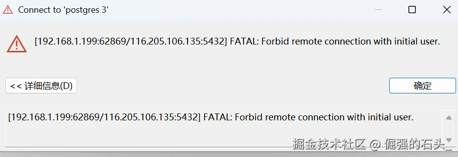 no pg_hba.conf entry、password authentication failed、Forbid remote connection with initial user等,便于快速定位; - 通过