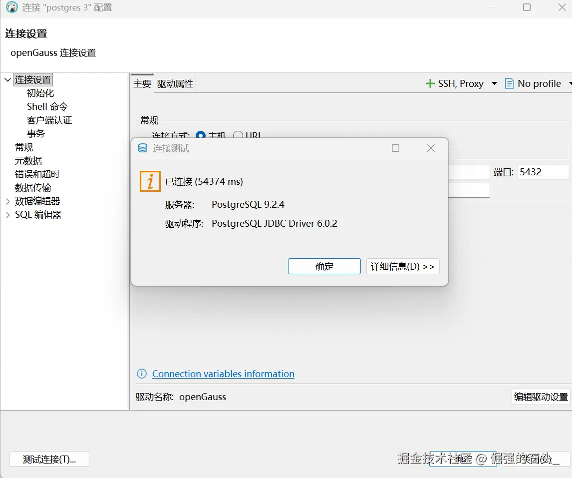 - 使用 openGauss JDBC 驱动或内置 PostgreSQL 驱动,配合属性如