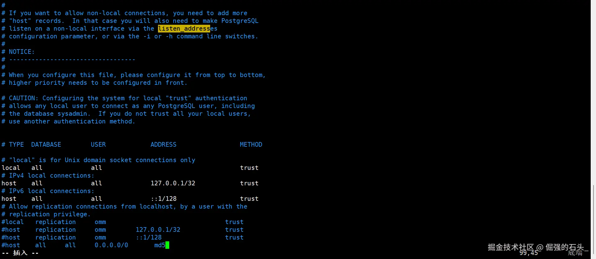 trust不应启用;本机访问可以保留local/127.0.0.1/::1的trust以便便捷运维。