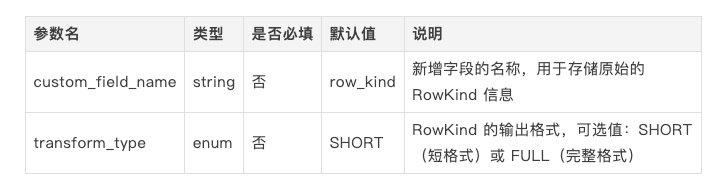 指定新增字段的名称,该字段用于存储原始的 RowKind 信息。