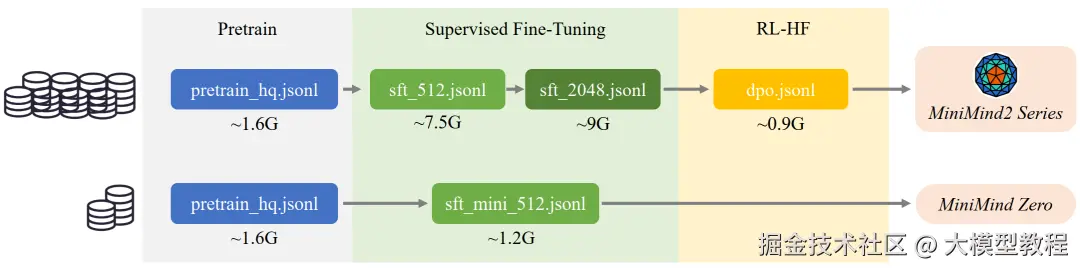 整个过程大概分几步。首先是预训练,就像让一个刚出生的婴儿去读海量的书籍报刊,虽然它还不懂怎么说话,但脑子里已经装满了各种知识。MiniMind用的是一份约1.6GB的高质量中文语料,让模型在这个阶段埋头"学习接龙",比如看到"秦始皇",它得学会接"是中国的第一位皇帝"。