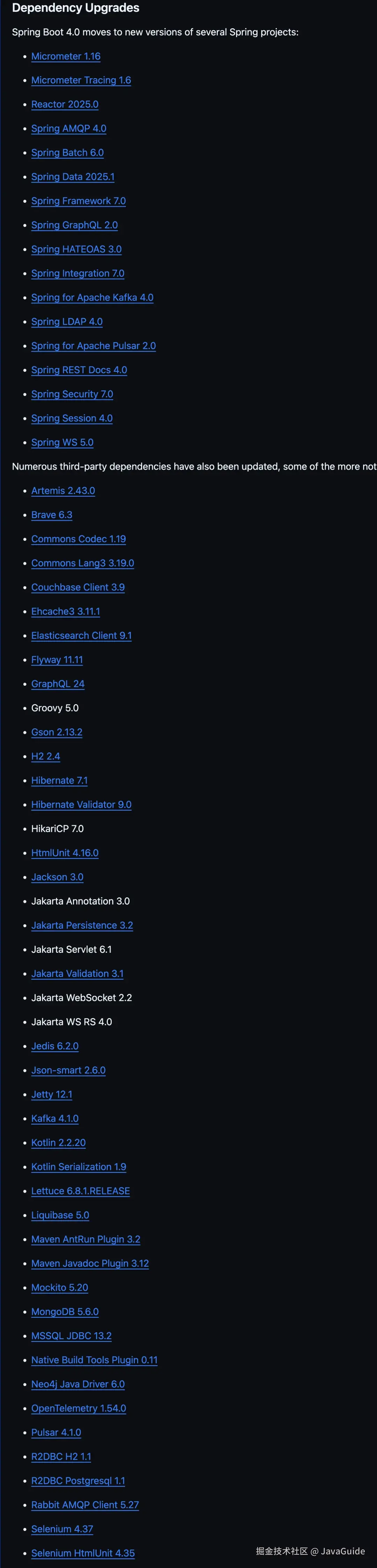 Spring Boot 4.0 迎来了一次"全家桶"式的依赖升级:Spring Framework 7.0、Jackson 3.0、Hibernate 7.1、Tomcat 11、Jetty 12、Kafka 4.1、Kotlin 2.2.20......