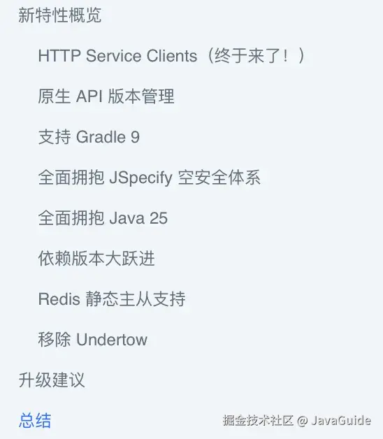 Spring Boot 4.0.0 正式发布,基于 Spring Framework 7.0,全面支持 Java 25(含虚拟线程优化)。核心新特性包括:HTTP Service Clients 简化远程调用;原生 API 版本管理;全面采用 JSpecify 空安全体系(默认非空,编译期防 NPE);关键依赖升级至 Jackson 3.0、Tomcat 11、Hibernate 7.1 等;支持 Gradle 9;Redis 静态主从配置;移除 Undertow。