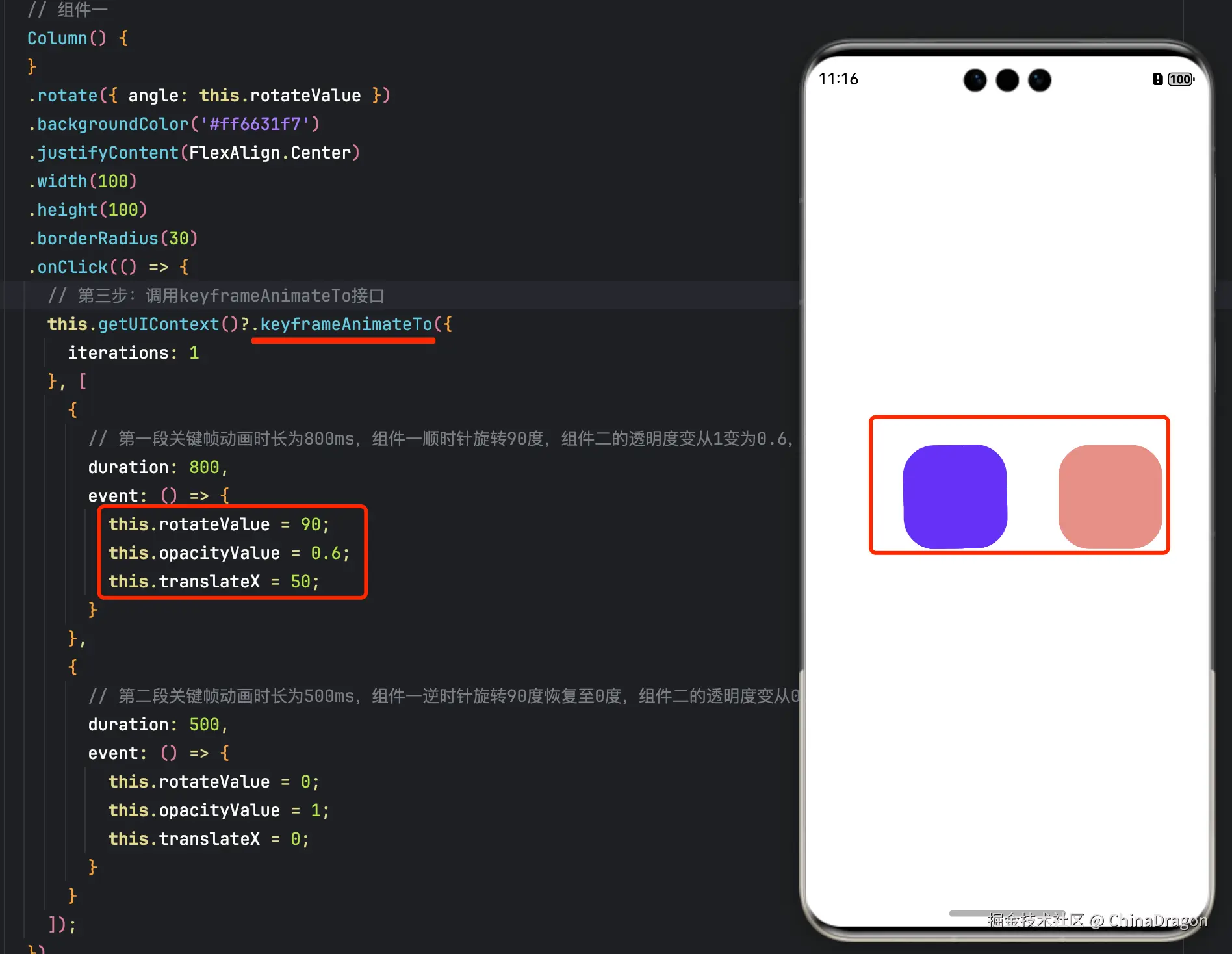 // 第二段关键帧动画时长为500ms,组件一逆时针旋转90度恢复至0度,组件二的透明度变从0.6变为1,组件二的translate从50位移到0