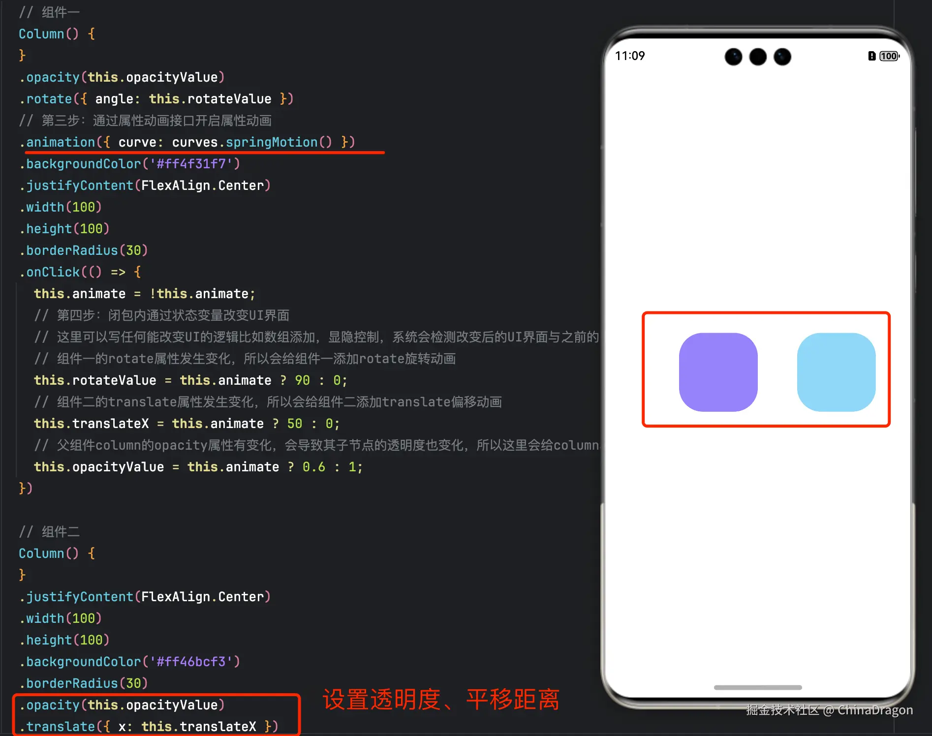 - 属性动画应该作用于始终存在的组件,对于将要出现或者将要消失的组件的动画应该使用转场动画。