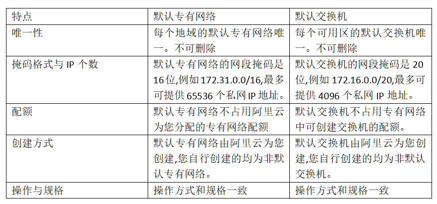 当一个地域第一次创建需要网络的云产品时,一个默认的专有网络和交换机也会随之创建成功。