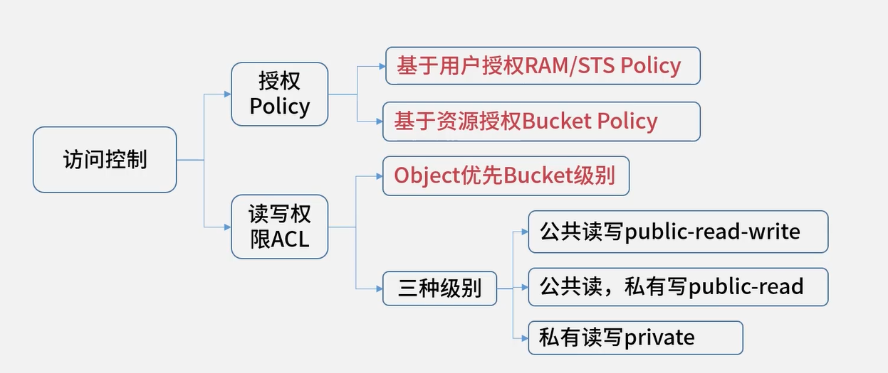也叫做读写权限ACL,Bucket和Object访问权限的访问策略。可以在创建存储空间(Bucket)或上传文件(Object)时配置ACL,也可以在创建Bucket或上传Object后的任意时间内修改ACL。