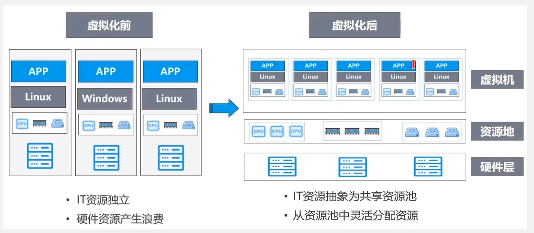 虚拟化:大量服务器汇集成一个超大的资源池,云操作系统统一管理。