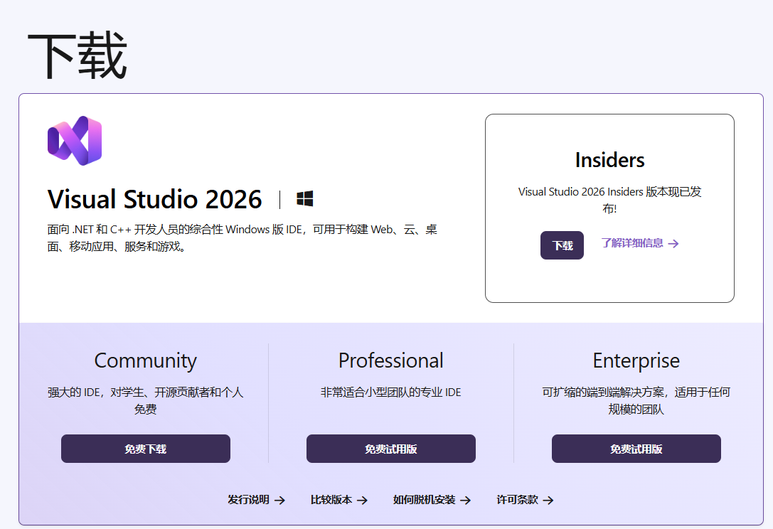 - Visual Studio 2026:目前为Insider预览版(引用),主要面向早期采用者,可能存在Bug(如引用的安装错误)。正式版预计将提供更长的支持周期。