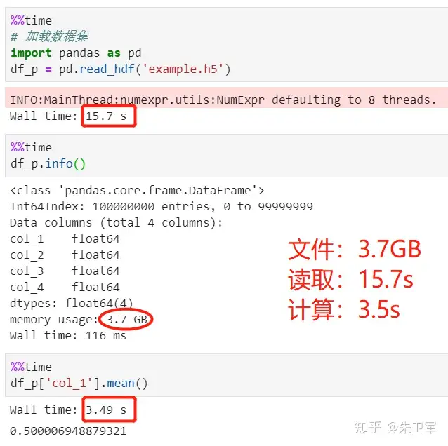 下面用pandas读取3.7个G的数据集(hdf5格式),该数据集共有4列、1亿行,并且计算第一行的平均值。我的电脑CPU是i7-8550U,内存8G,看看这个加载和计算过程需要花费多少时间。