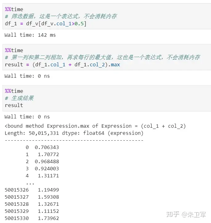 vaex则全过程都是零内存。因为它的处理过程仅仅产生expression(表达式),表达式是逻辑表示,不会执行,只有到了最后的生成结果阶段才会执行。而且整个过程数据是流式传输,不会产生内存积压。