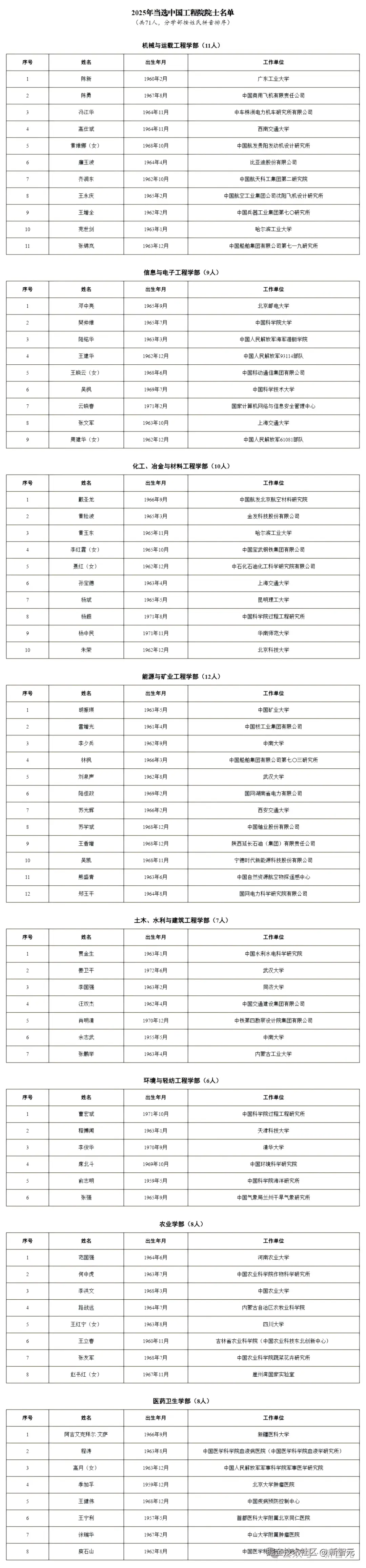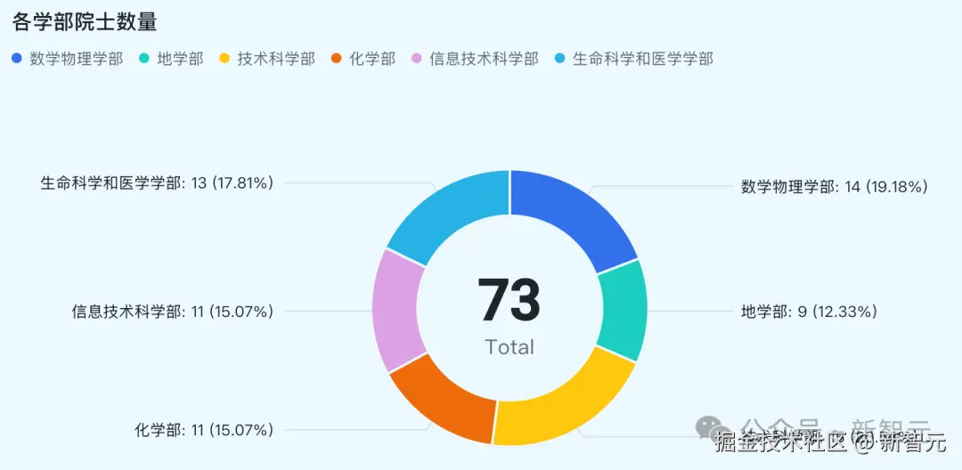 其中,各学部院士数量如下,数学物理学部 14 人,化学部 11 人,生命科学和医学学部 13 人,地学部 9 人,信息技术科学部 11 人,技术科学部 15 人,共 73 人。