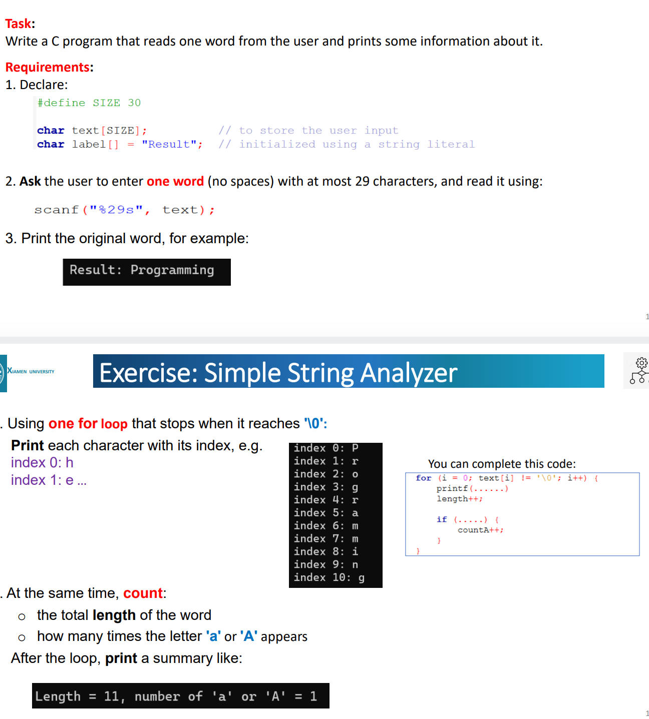 printf("length=%d,number od 'a' or 'A'=%d",length,count);