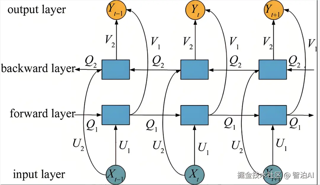 为了更清晰地展示细节,下图直观呈现了关键结构。需特别说明的是,图中虽显示为两个隐藏层,但实际为同一隐藏层在不同时间步的复用。