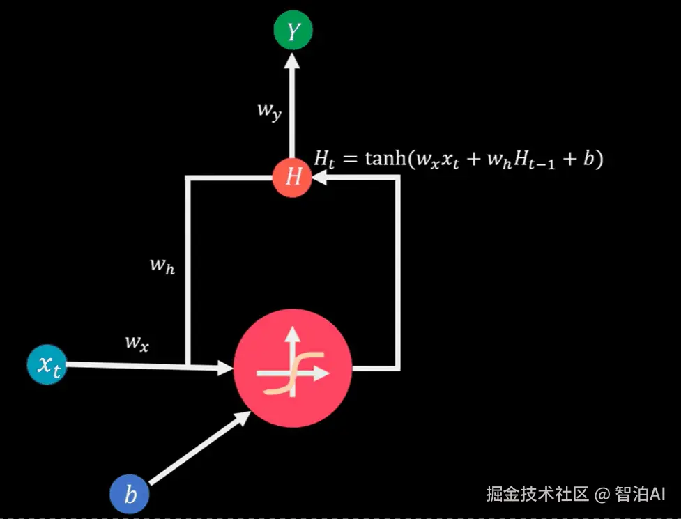 ht-1和xt都是神经网络的输入,与各自的权重系数相乘,再加上偏置,就是标准的神经元运算过程,只不过后面加了一步求和再激活,h的数值和过去有关,相当于一个记忆。