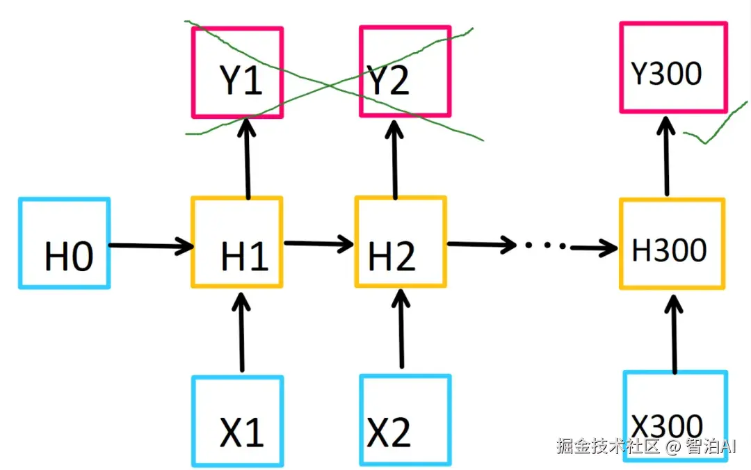 在训练过程中,我们仅保留最终时间步(第300步)的输出结果Y300,将其作为特征输入到全连接层。