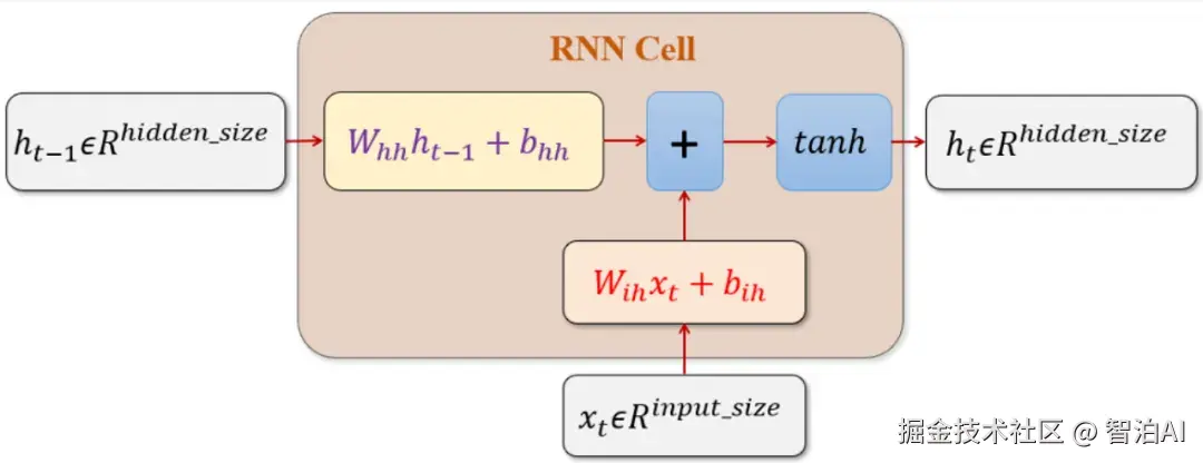 由于各时间步的权重矩阵存在差异,因此隐藏层的运算结果也会相应变化。该图完整展示了RNN单步的计算流程,理解此图即可掌握RNN的核心原理。