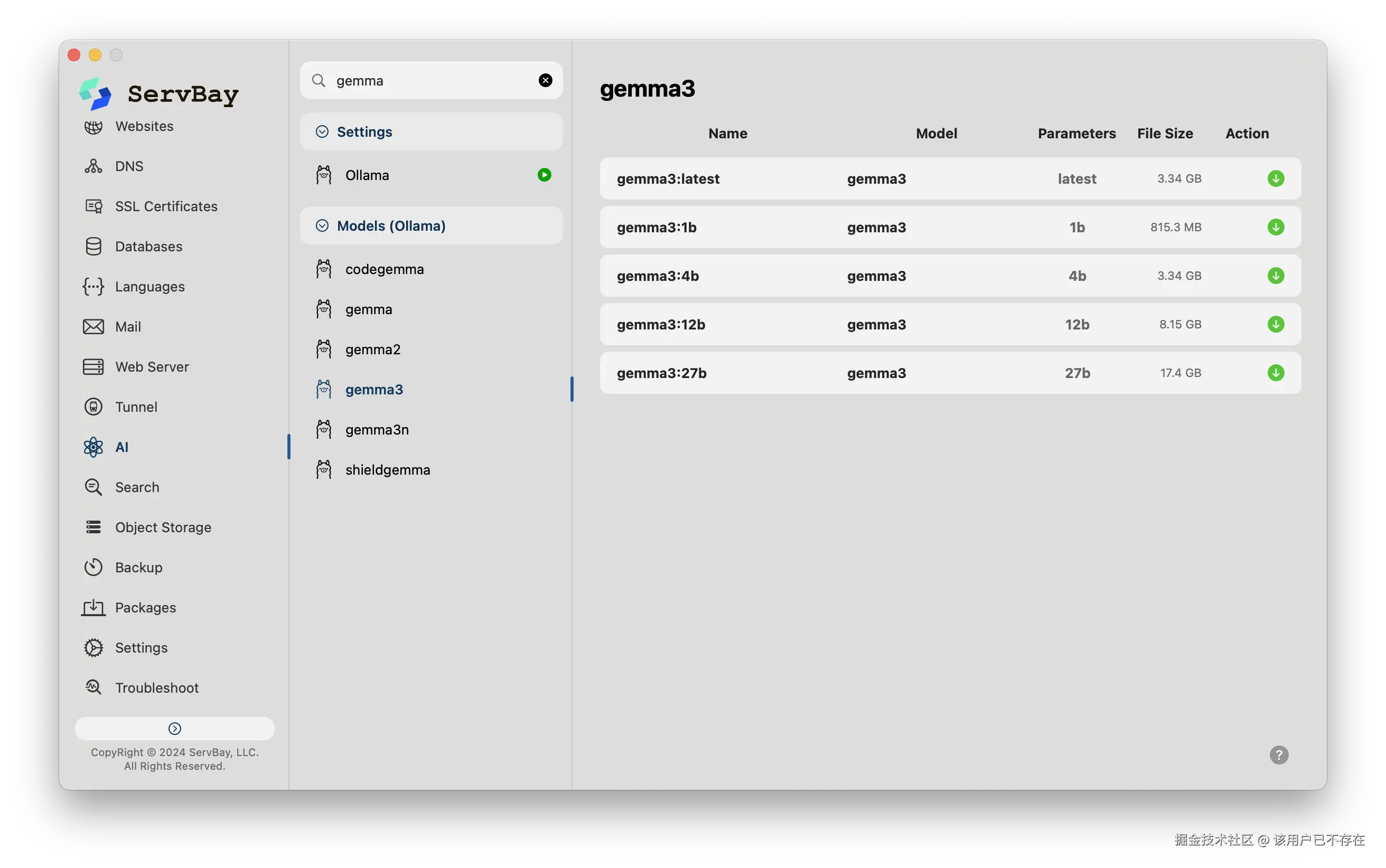 - Antigravity 强在云端算力,而 ServBay 强在本地隐私。ServBay 支持一键在本地部署 Gemma、Qwen 3 等开源模型。用户不需要配置复杂的 Python 环境或显卡驱动,点一下就能在本地跑起一个 AI 编程助手。这对于处理公司敏感代码或无网环境开发至关重要。