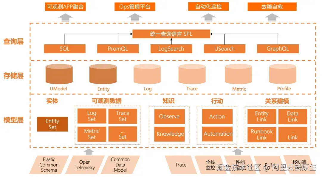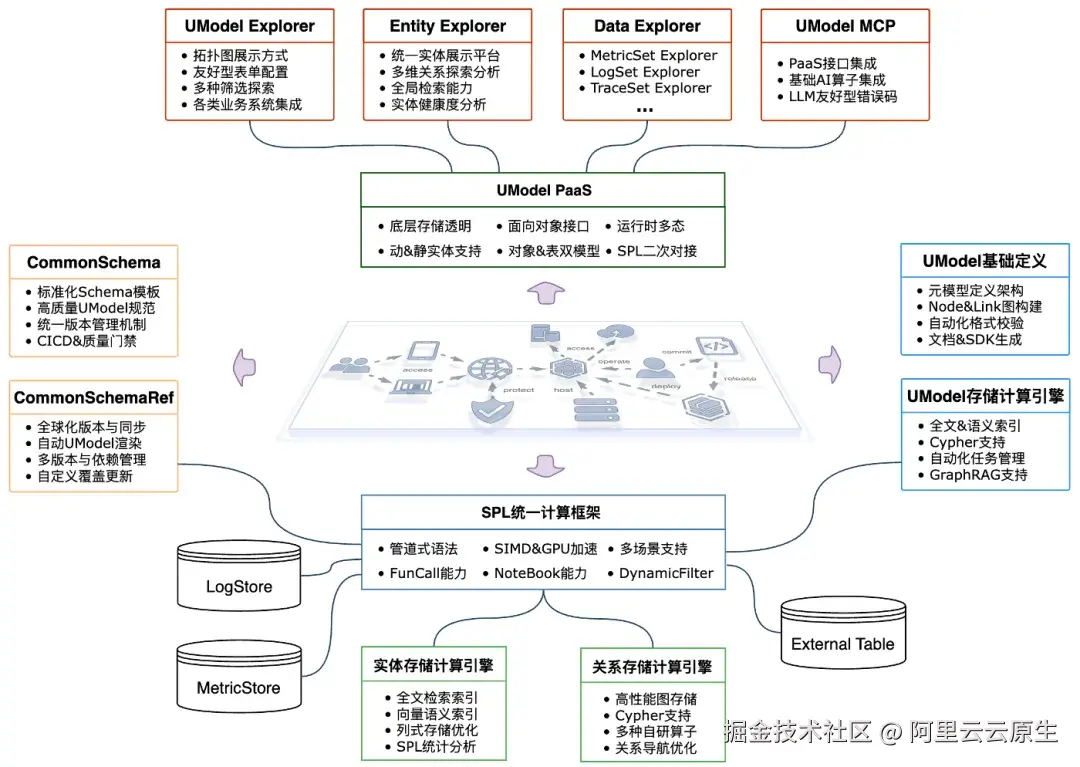 - 技术基础设施: 专为可观测场景构建的实体、关系的存储计算引擎,能够快速回溯到任意时刻的系统状态,支持高性能的图查询、关系计算、多维分析等能力。提供管道式、高性能 SPL 统一计算框架,支持关联 UModel、实体、关系、观测数据等各类数据。