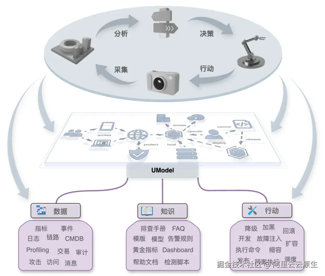 这些阶段本身也是我们在做 AIOps 逐渐试错和优化的过程,面对 AI 逐渐从理论、落地到改变世界的迅速推进,我们推出的 UModel 这一结构化的运维世界模型,将数据、逻辑和行动串联起来,为 AI 提供了可推理、可交互的知识图谱。