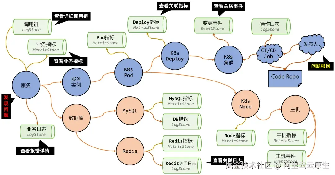 - 根据实体的连接关系一步步排查,每类实体都有对应的可观测数据,按图索骥。