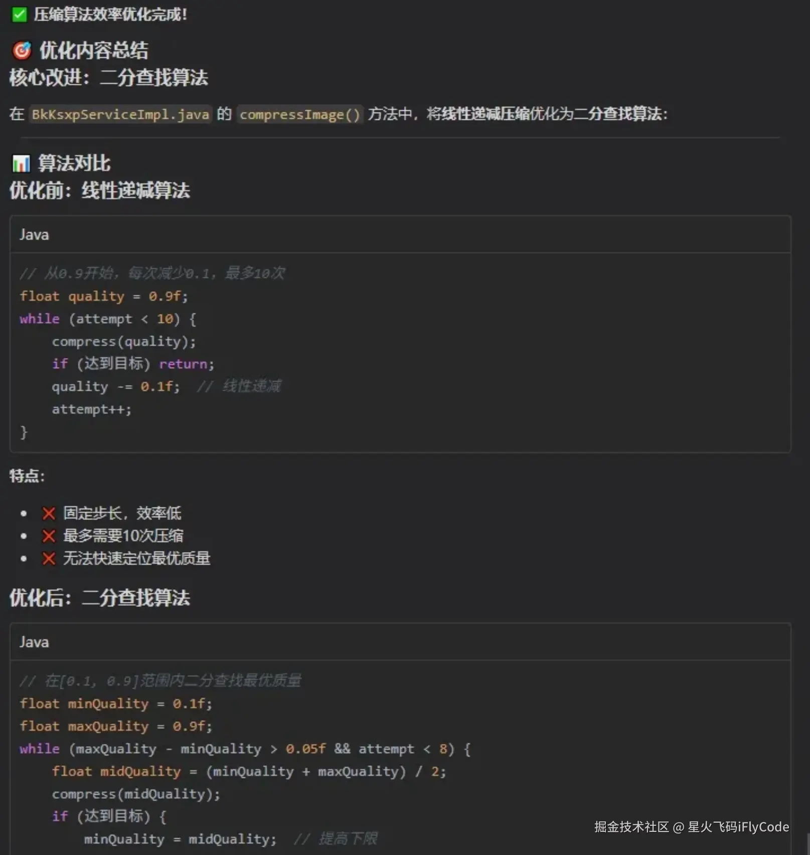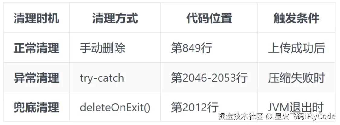 // 1. 创建时设置自动清理compressedFile = File.createTempFile("compressed_", ".jpg");compressedFile.deleteOnExit(); // JVM退出时自动删除// 2. 正常使用后清理if (fileToUpload != readFile && fileToUpload.exists()) { fileToUpload.delete();}// 3. 异常情况清理catch (Exception e) { if (compressedFile != null && compressedFile.exists()) { try { compressedFile.delete(); } catch (Exception deleteEx) { SysLogUtils.printLogger("删除临时文件失败"); } }}