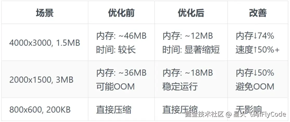 finallong LARGE_FILE_THRESHOLD = 2 * 1024 * 1024L; // 2MBfinalint LARGE_DIMENSION_THRESHOLD = 2000; // 2000像素// 满足以下任一条件触发预缩放:// 1. 文件大小 > 2MB// 2. 宽度 > 2000px// 3. 高度 > 2000px