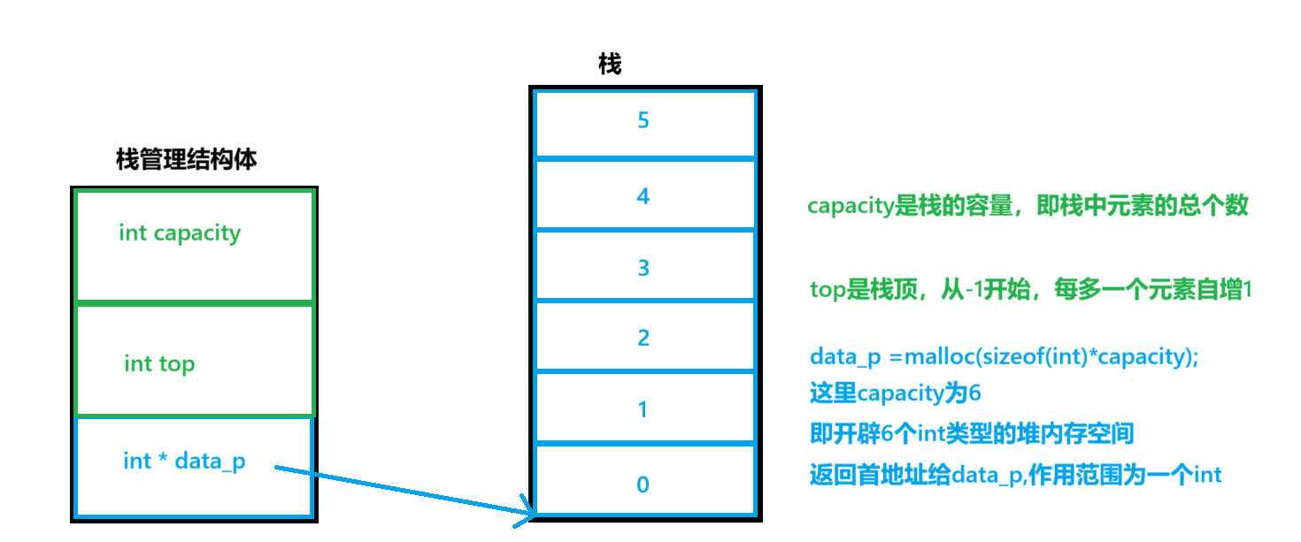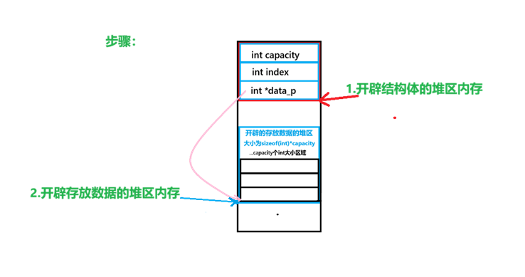 p->data_p=malloc((sizeof(int)*capacity)); //继续开辟存放数据的堆空间内存