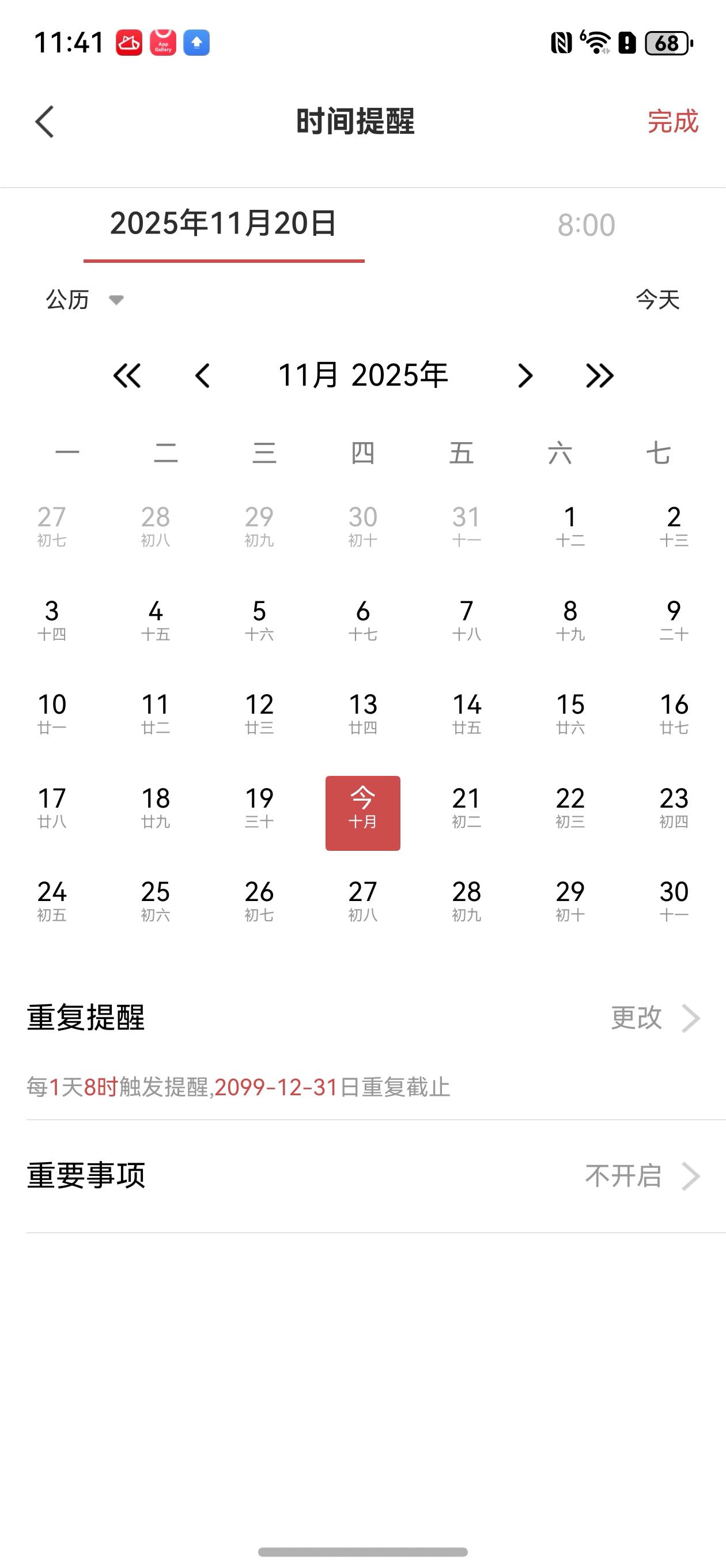 提醒功能简直是拖延症和健忘星人的救星!不仅支持预设具体时间提醒,还能自由选择公历或农历日期,像节日、纪念日这种按农历算的日子,再也不用手动换算。重复提醒也特别灵活,日、周、月甚至自定义间隔周期都能设置,适合工资发放、账单缴纳等固定事项。重要事项还能设置强提醒,反复弹窗直到确认标记完成,完全杜绝 "看到提醒却忘了处理" 的情况。
