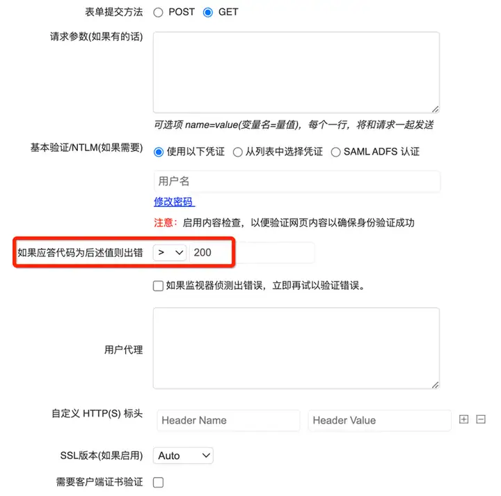 添加网页监控,在返回的状态码>200时告警(可以调整为任意数值,也可以配置=、<的阈值):