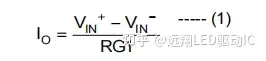 负载电流(IS)从电源流出,并在感测电阻(RS)处产生电压差(VIN+ - VIN-)。假设内部MOSFET漏电流与源电流(IO)相同,且VIP非常接近,则FP135传递函数为: