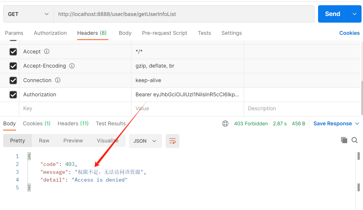 ②.访问http://localhost:8888/user/base/getUserInfoList 获取所有用户信息(请求头添加字段Authorization,值是Bearer+空格+第一步获取的access_token)
