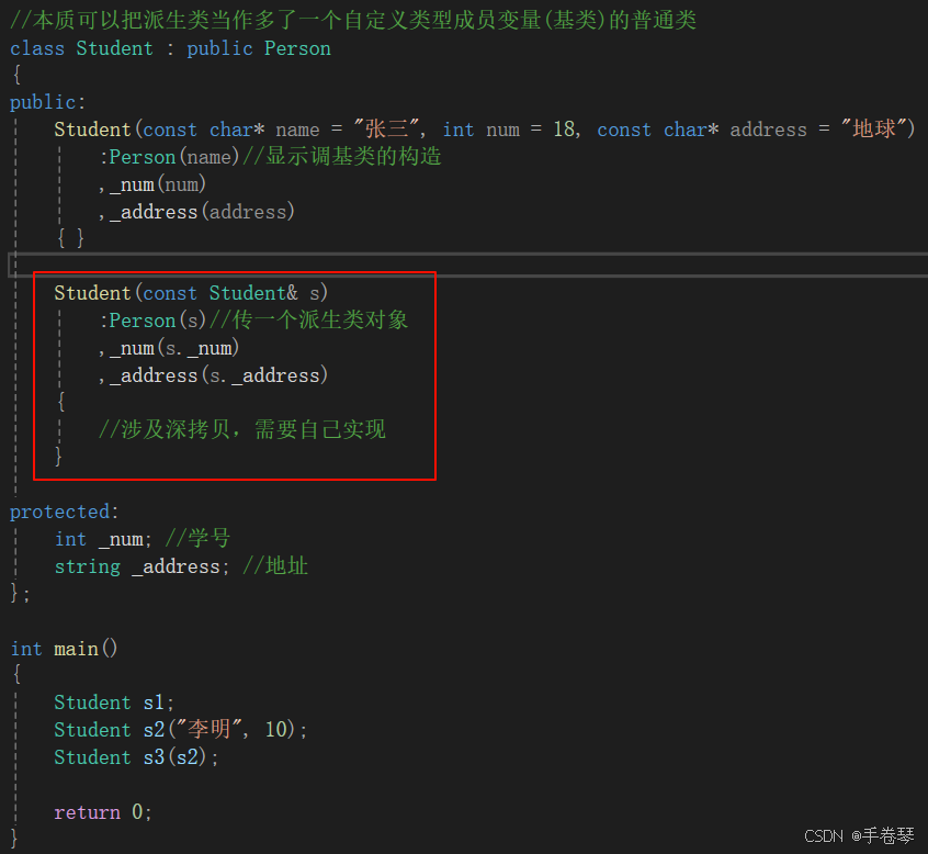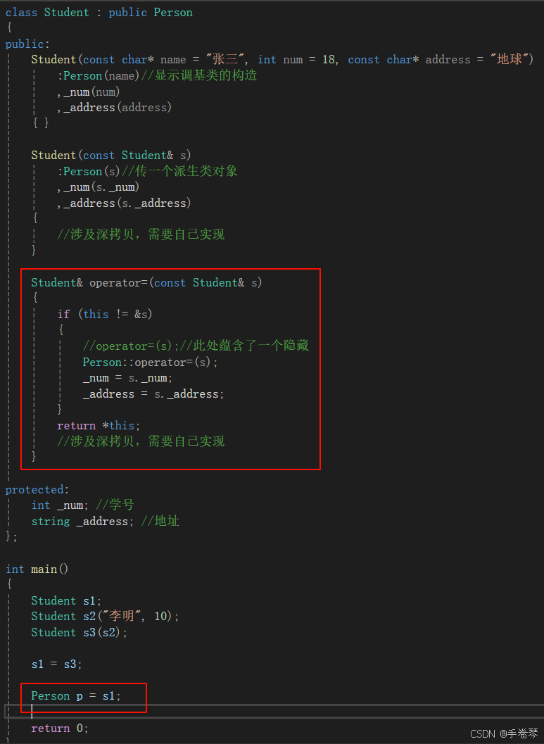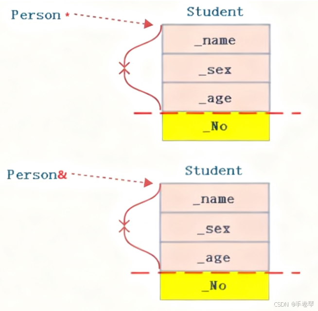 但在Public继承中,就是一个特殊处理的例外,派生类对象可以赋值给基类的指针/基类的引用,而不需要加const,这里的指针和引用绑定是派生类对象中的基类部分: