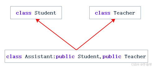 多继承:一个派生类有两个或以上直接基类时称这个继承关系为多继承,多继承对象在内存中的模型是,先继承的基类在前面,后面继承的基类在后面,派生类成员在放到最后面