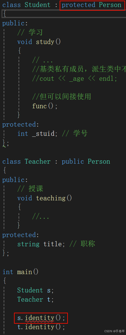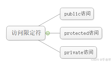 - 基类private成员在派生类中是不能被访问,如果基类成员不想在类外直接被访问,但需要在派生类中能访问,就定义为protected。可以看出保护成员限定符是因继承才出现的。