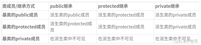 通过上述表格会发现,基类的私有成员在派生类都是不可见。基类的其他成员在派生类的访问方式== Min(成员在基类的访问限定符,继承方式),public > protected >private