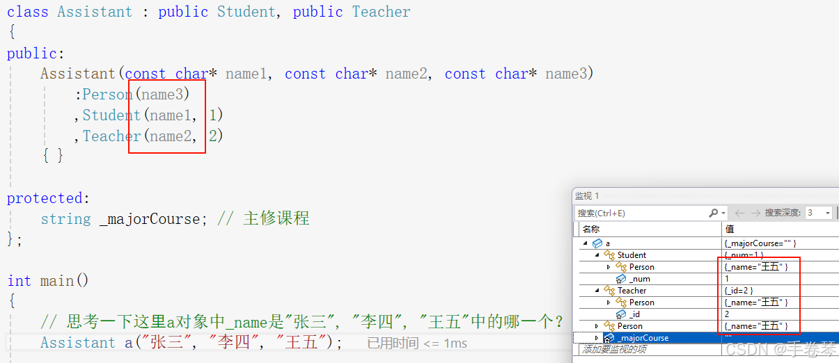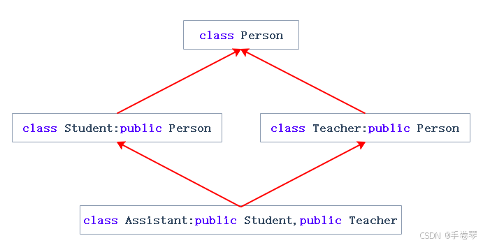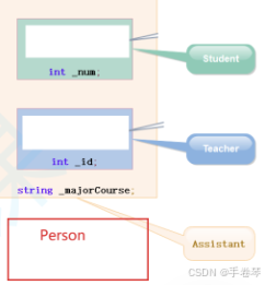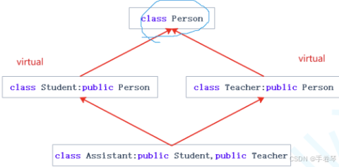 菱形继承 :菱形继承是多继承的一种特殊情况。菱形继承的问题,从下面的对象成员模型构造,可以看出菱形继承有数据冗余和二义性的问题,在Assistant的对象中Person成员会有两份。支持多继承就一定会有菱形继承,像Java就直接不支持多继承,规避掉了这里的问题,所以实践中,我们需要避免设计出菱形继承这样的模型。
