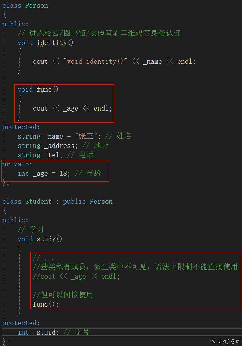 - 基类private成员在派生类中无论以什么方式继承都是不可见的。这里的不可见是指基类的私有成员是被继承到了派生类对象中,但是语法上限制派生类对象不管在类里面还是类外面都不能去访问它。