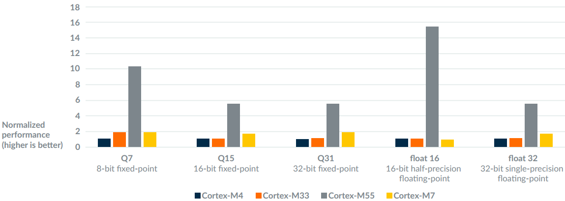 3、M55与M7,M33,M4的DSP性能对比,速度提升杠杠的,灰色是M55,越高性能越强: