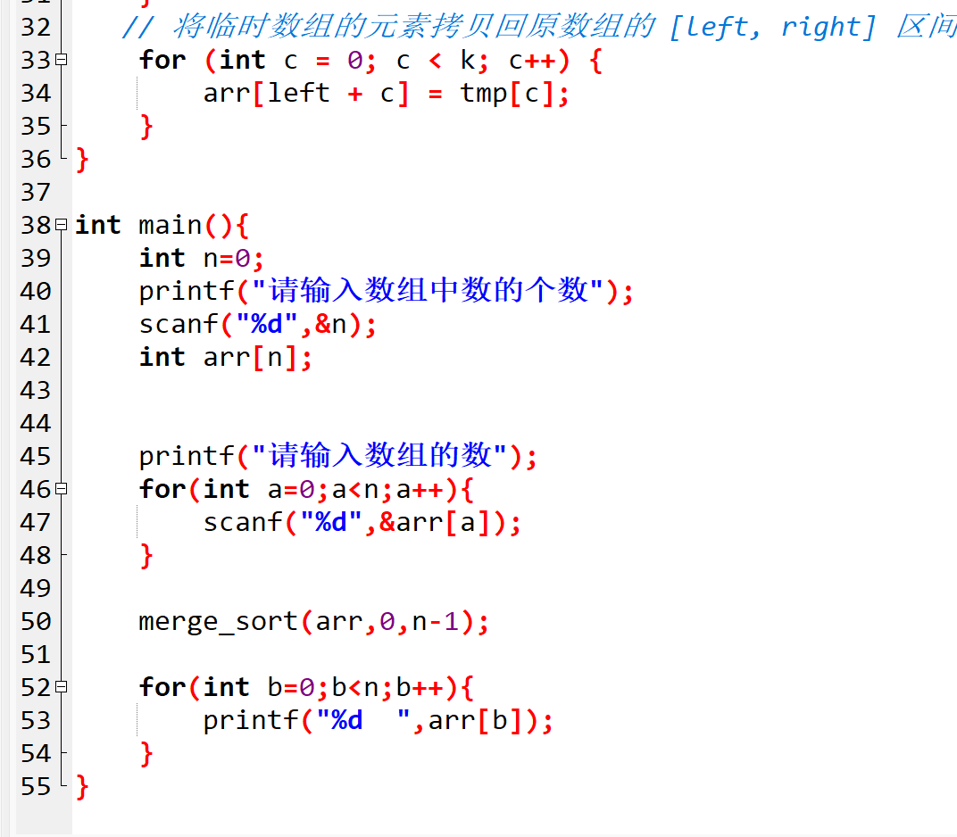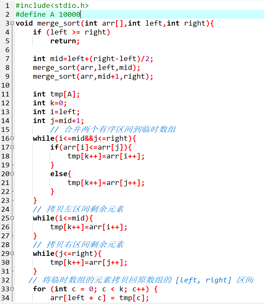 - 临时数组的定义:当前tmp是在函数内定义的局部数组,每次递归调用都会创建一个新数组,可能导致栈内存占用过高。可以将tmp改为全局数组,或在main函数中定义后作为参数传入merge_sort,减少内存开销。