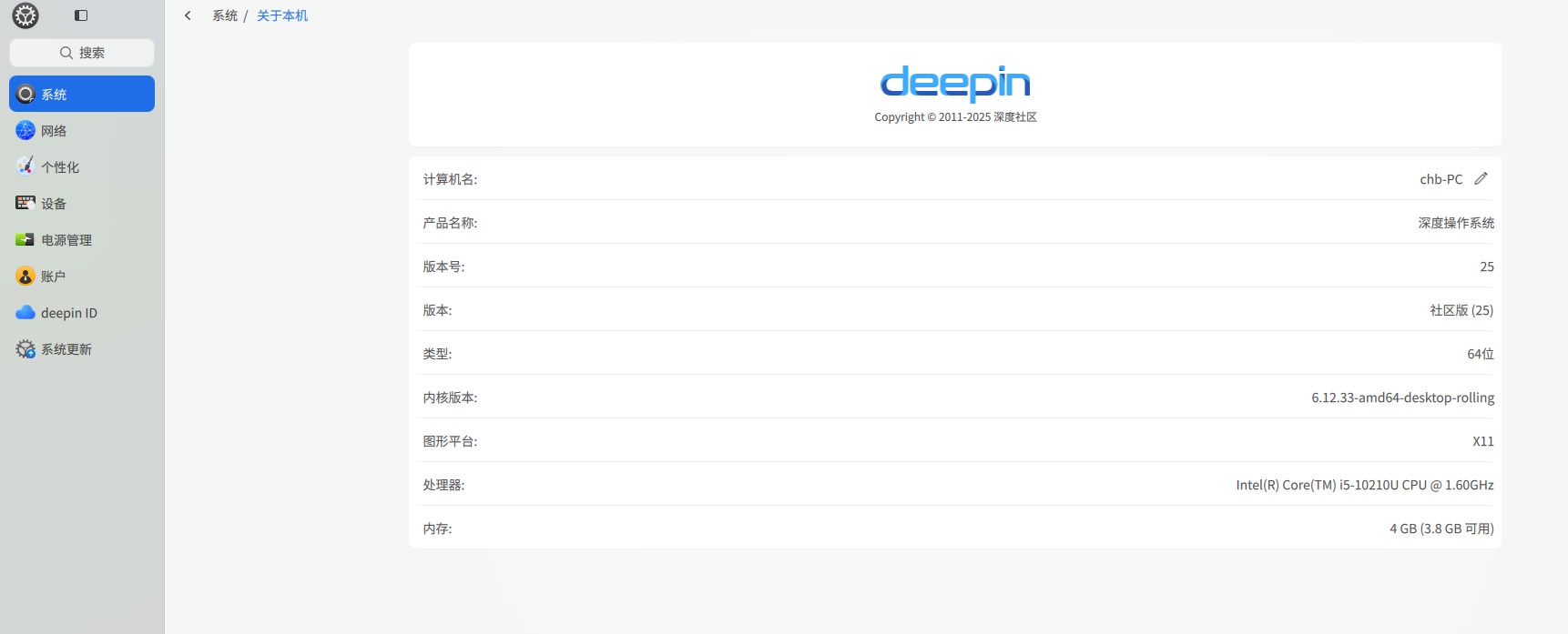 当前时间是2025年11月20日,我所使用的deepin版本如下: