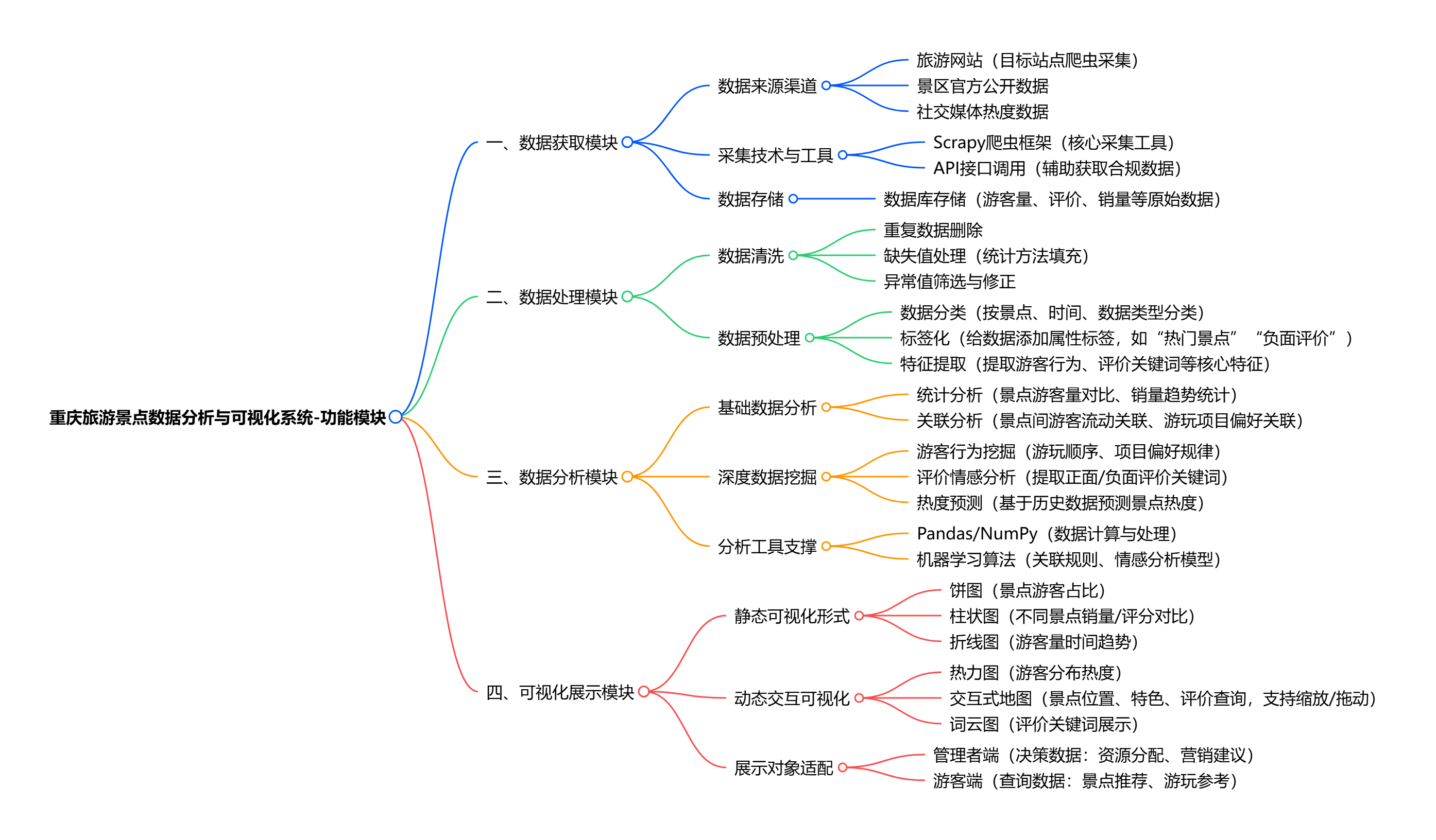 重庆旅游景点数据分析与可视化系统核心功能可概括为四部分:
