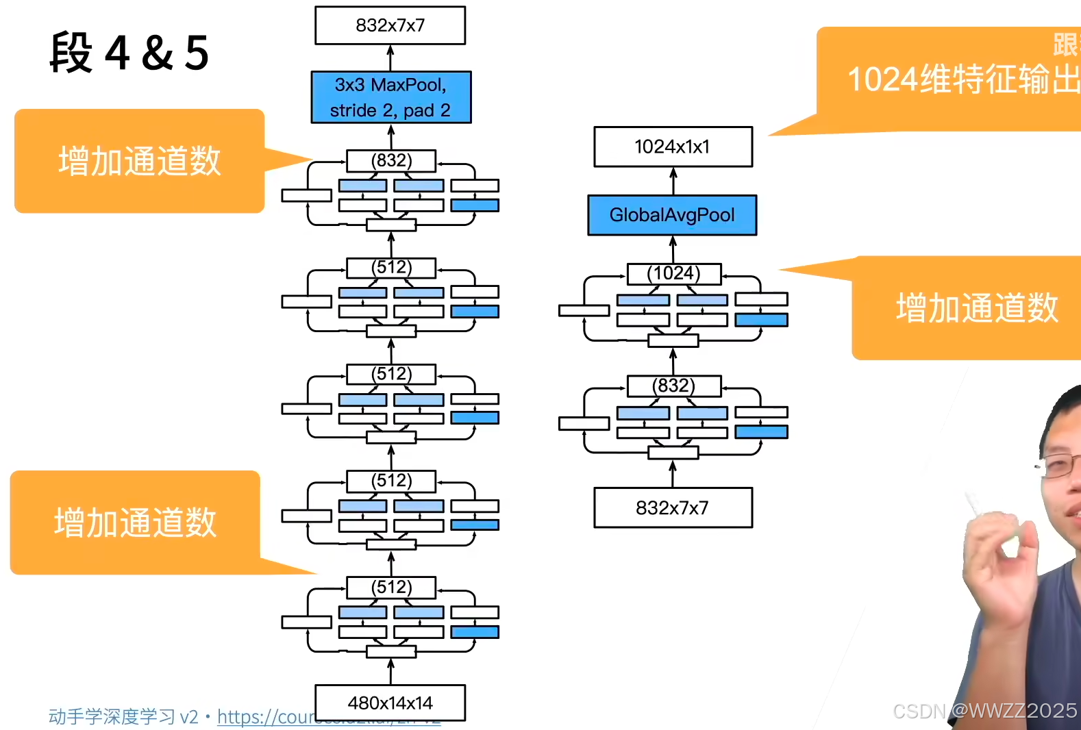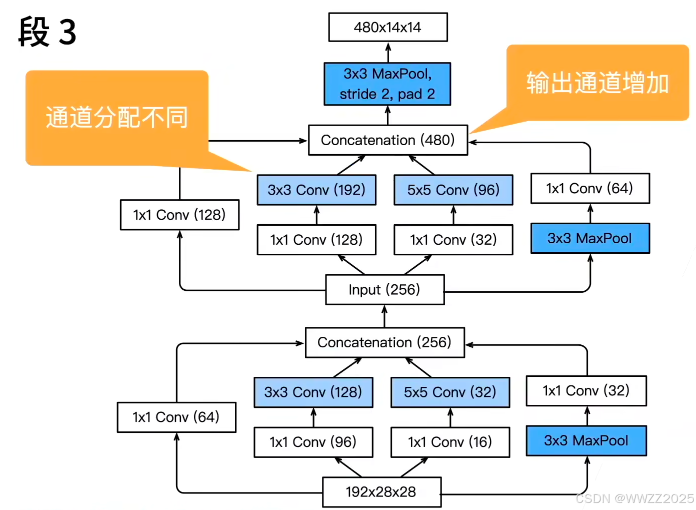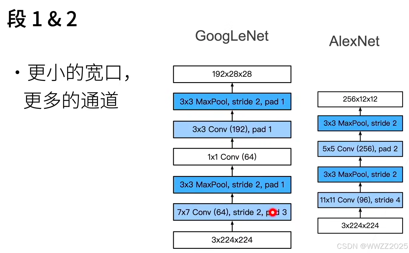 import torch from torch import nn from torch.nn import functional as F from d2l import torch as d2l class Inception(nn.Module): # c1--c4是每条路径的输出通道数 def __init__(self, in_channels, c1, c2, c3, c4, **kwargs): super(Inception, self).__init__(**kwargs) # 线路1,单1x1卷积层 self.p1_1 = nn.Conv2d(in_channels, c1, kernel_size=1) # 线路2,1x1卷积层后接3x3卷积层 self.p2_1 = nn.Conv2d(in_channels, c2[0], kernel_size=1) self.p2_2 = nn.Conv2d(c2[0], c2[1], kernel_size=3, padding=1) # 线路3,1x1卷积层后接5x5卷积层 self.p3_1 = nn.Conv2d(in_channels, c3[0], kernel_size=1) self.p3_2 = nn.Conv2d(c3[0], c3[1], kernel_size=5, padding=2) # 线路4,3x3最大汇聚层后接1x1卷积层 self.p4_1 = nn.MaxPool2d(kernel_size=3, stride=1, padding=1) self.p4_2 = nn.Conv2d(in_channels, c4, kernel_size=1) def forward(self, x): p1 = F.relu(self.p1_1(x)) p2 = F.relu(self.p2_2(F.relu(self.p2_1(x)))) p3 = F.relu(self.p3_2(F.relu(self.p3_1(x)))) p4 = F.relu(self.p4_2(self.p4_1(x))) # 在通道维度上连结输出 return torch.cat((p1, p2, p3, p4), dim=1)(2)GoogLeNet模型